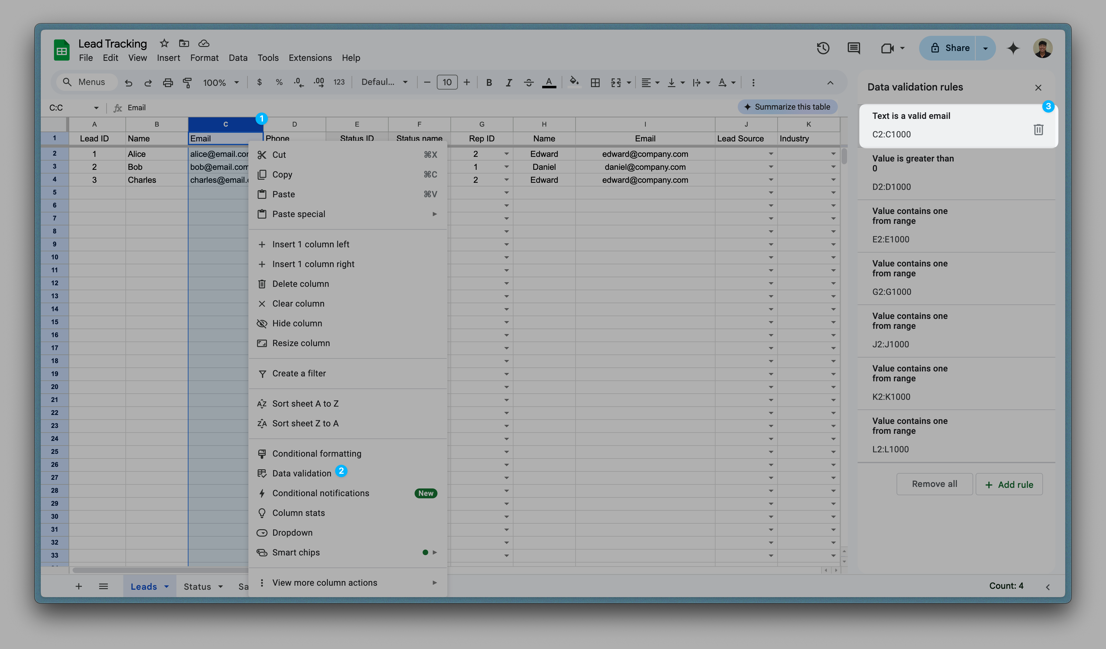 For the Email column in the Leads Sheet, select the cells under the Email column. Click on data, then click data validation and add rule. Click text is a valid email to ensure only valid emails are entered.