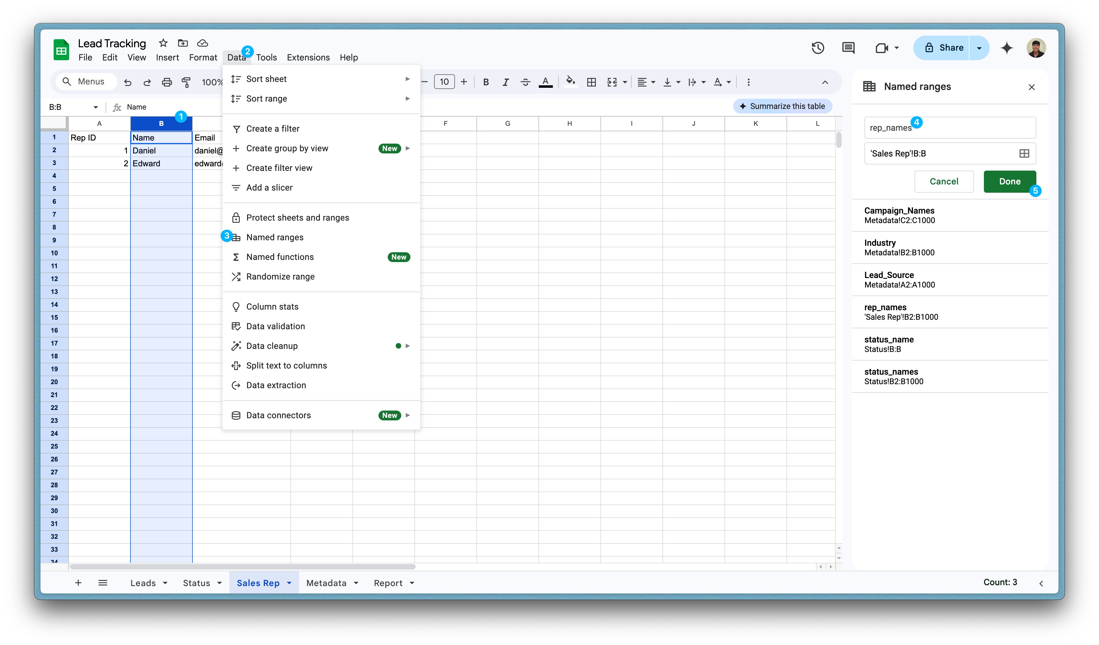 Repeat this step for the Sales Rep Sheet in the name column, and create another named range, e.g., rep_names.
