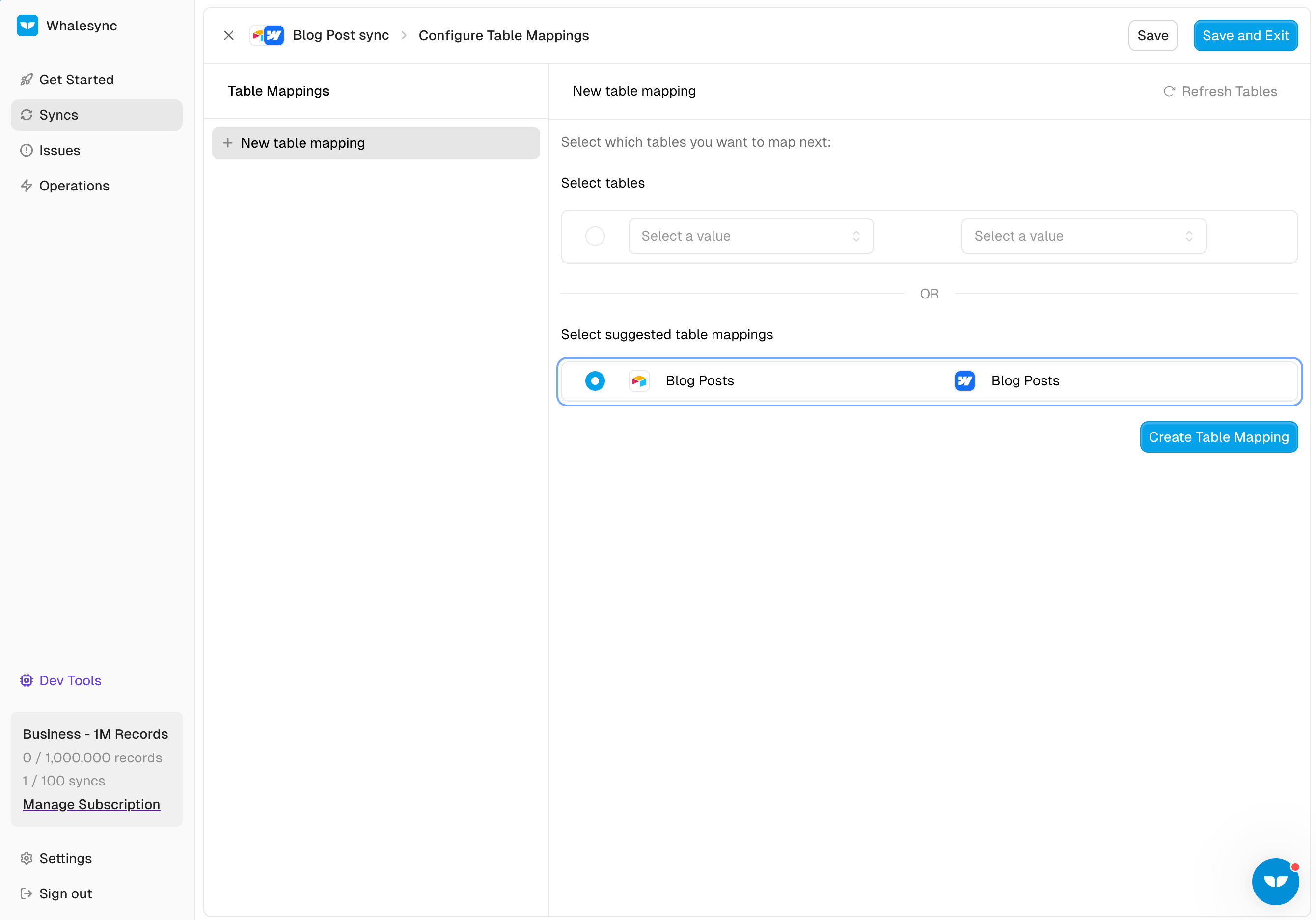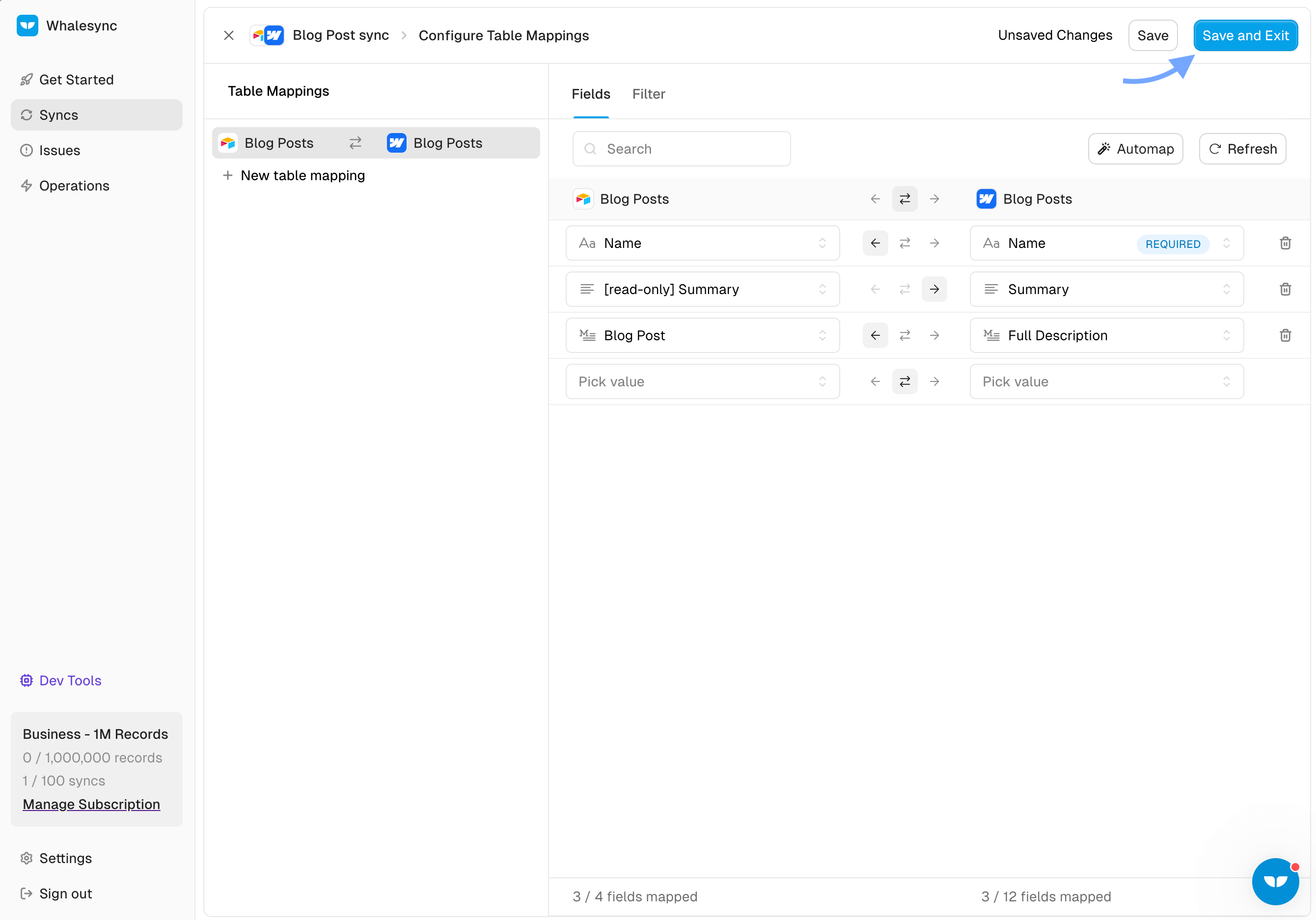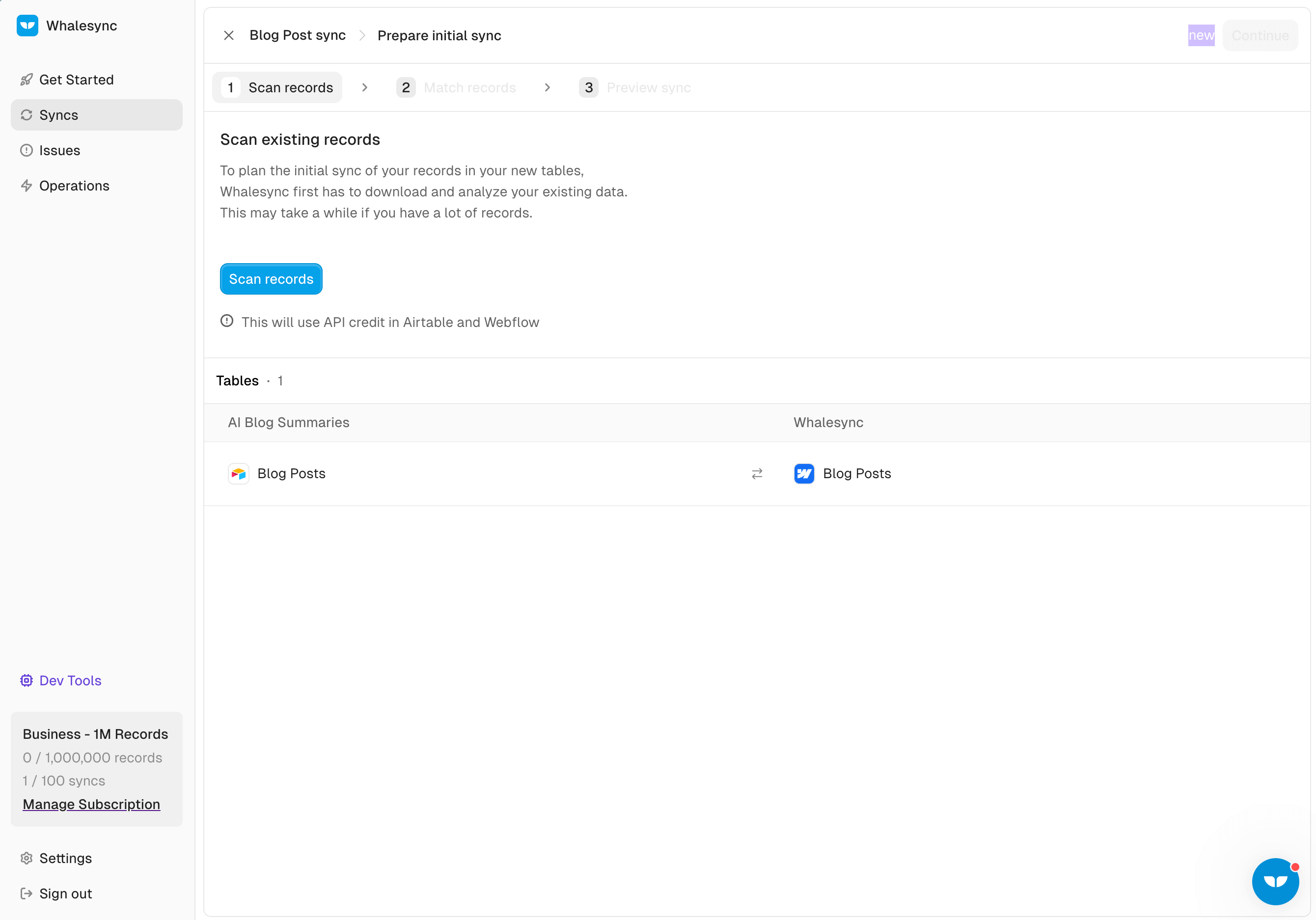 https://app.whalesync.com/ - Map the Blog Posts collection in Webflow with the Blog Posts collection in Airtable.
