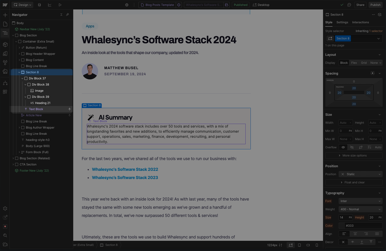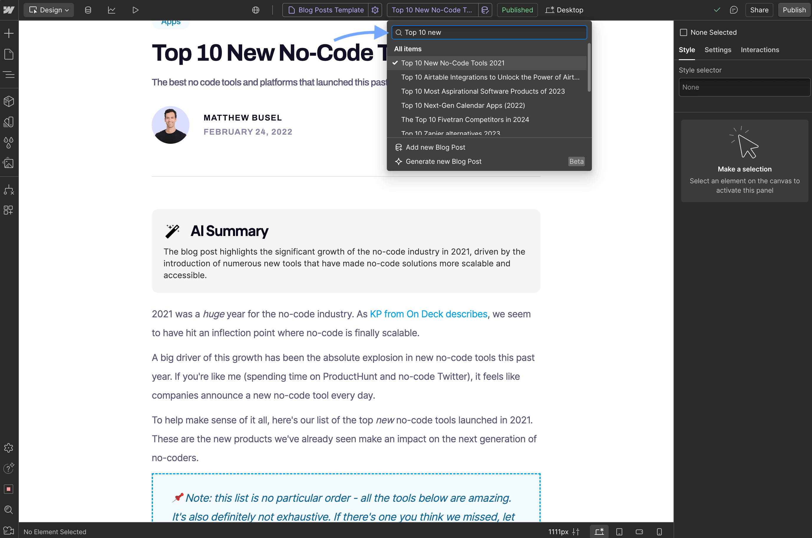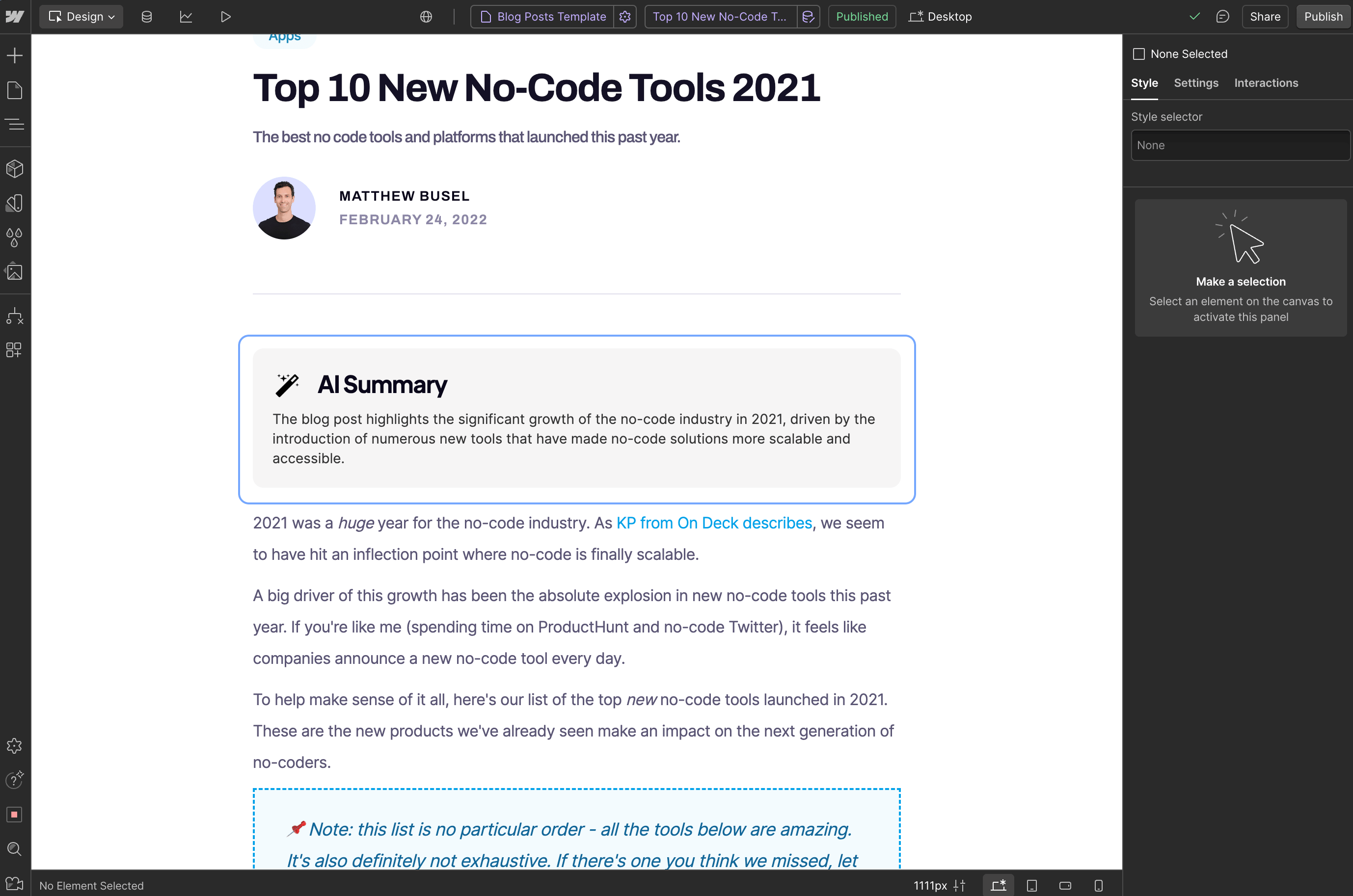In this guide, we’ll go step-by-step on how you can add AI summaries to the top of each of your blog posts using Webflow, Airtable, and Whalesync.