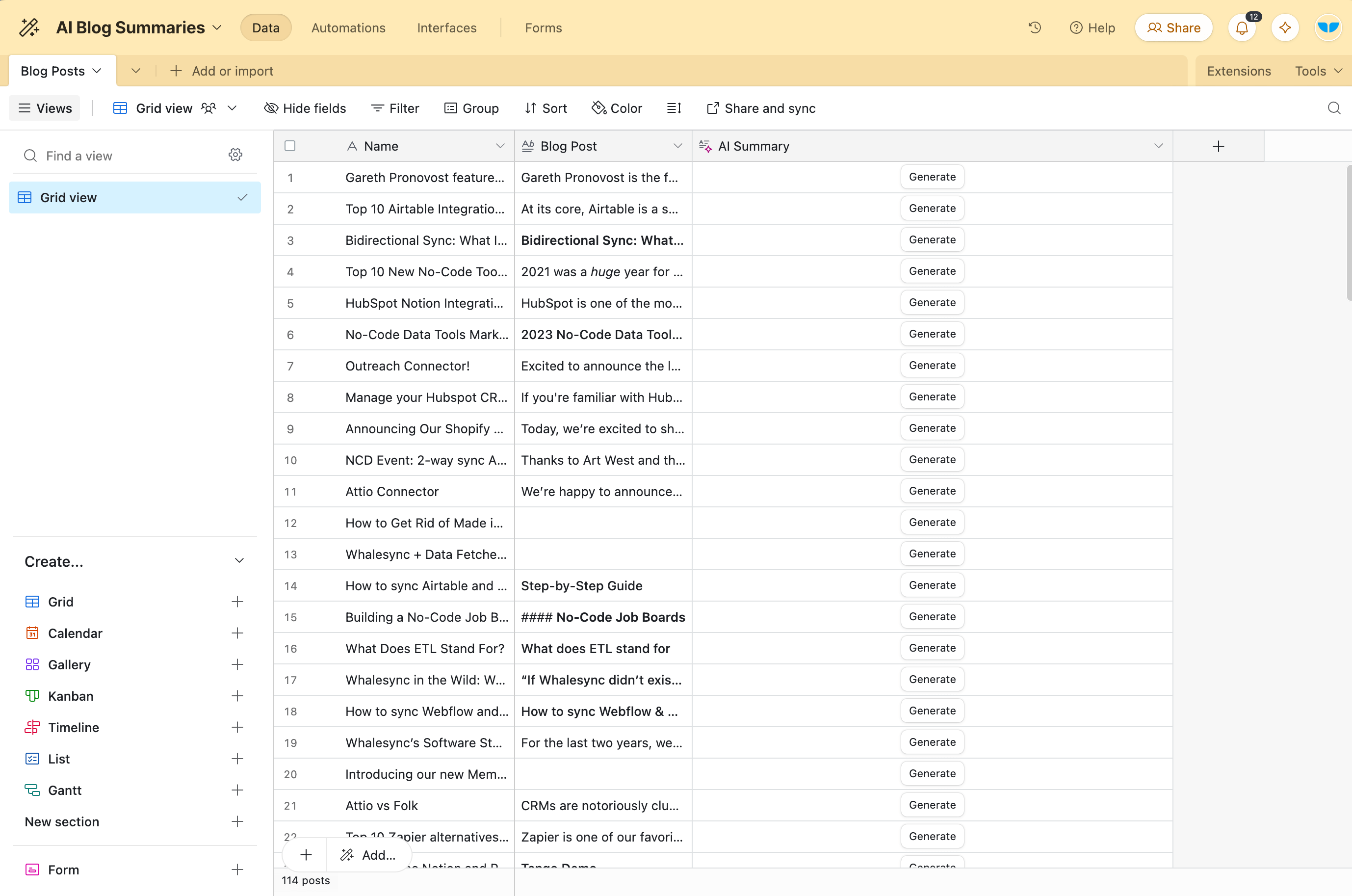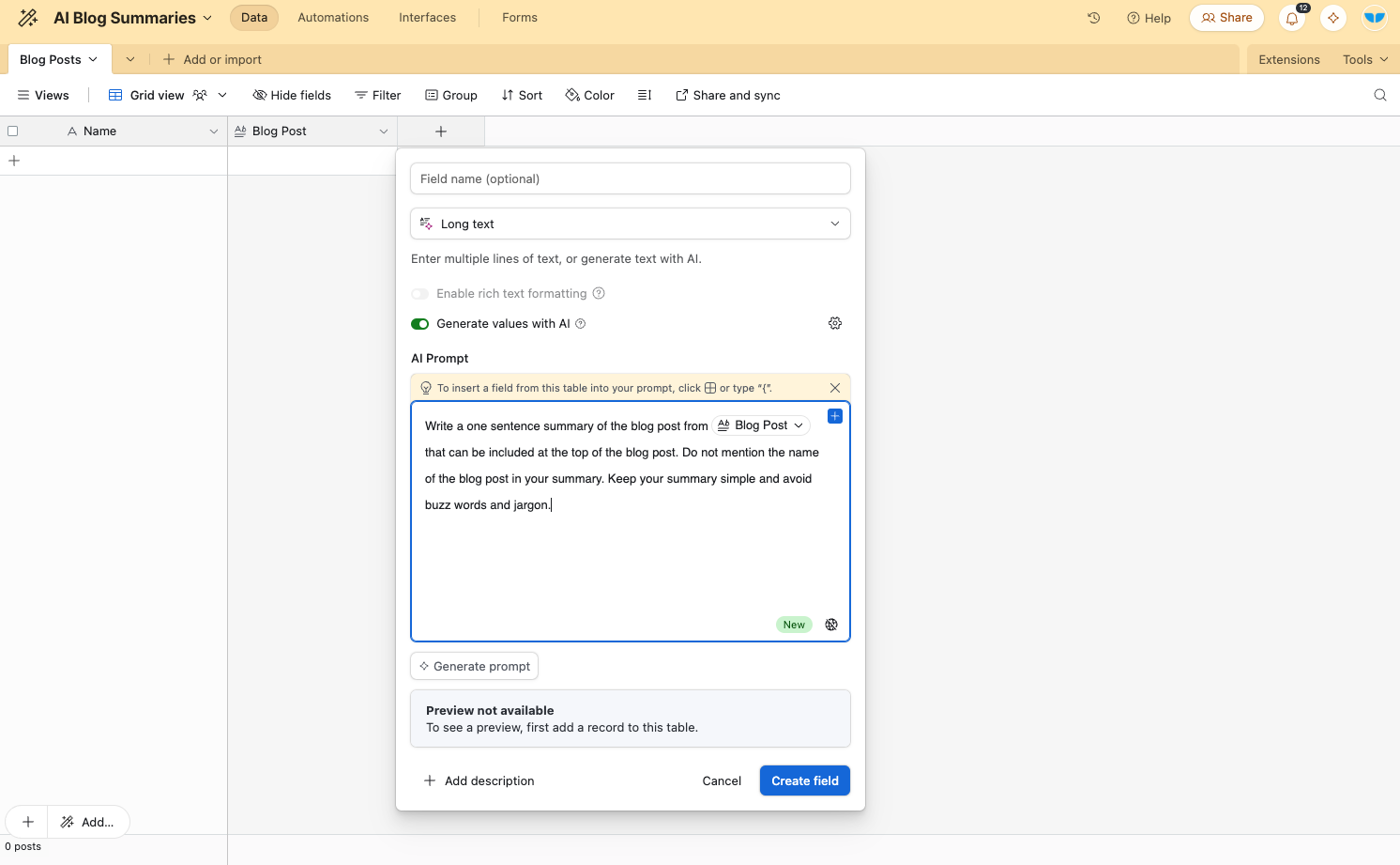 - Create a simple Airtable table with fields for Name, Blog Post, and AI Summary