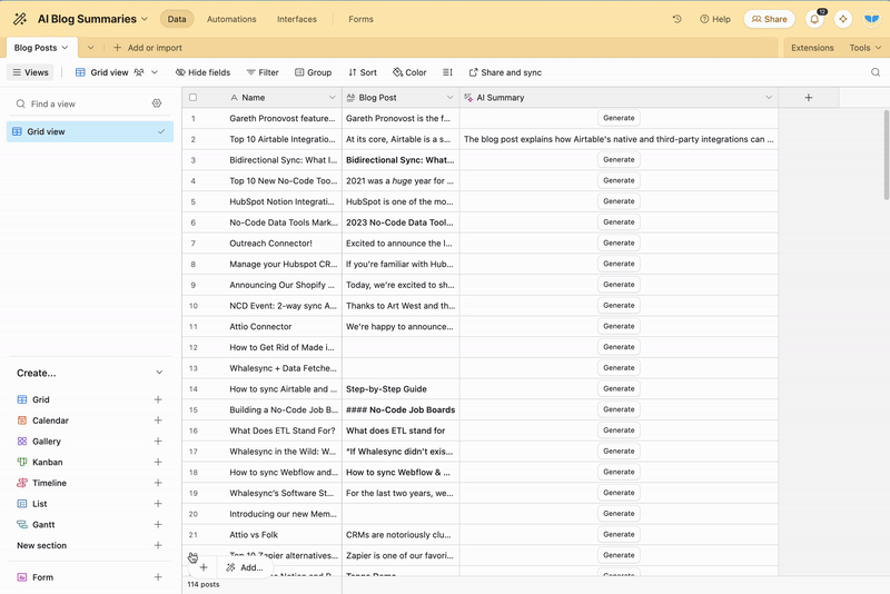- In Airtable, click “Generate” in the AI Summary field for one row.