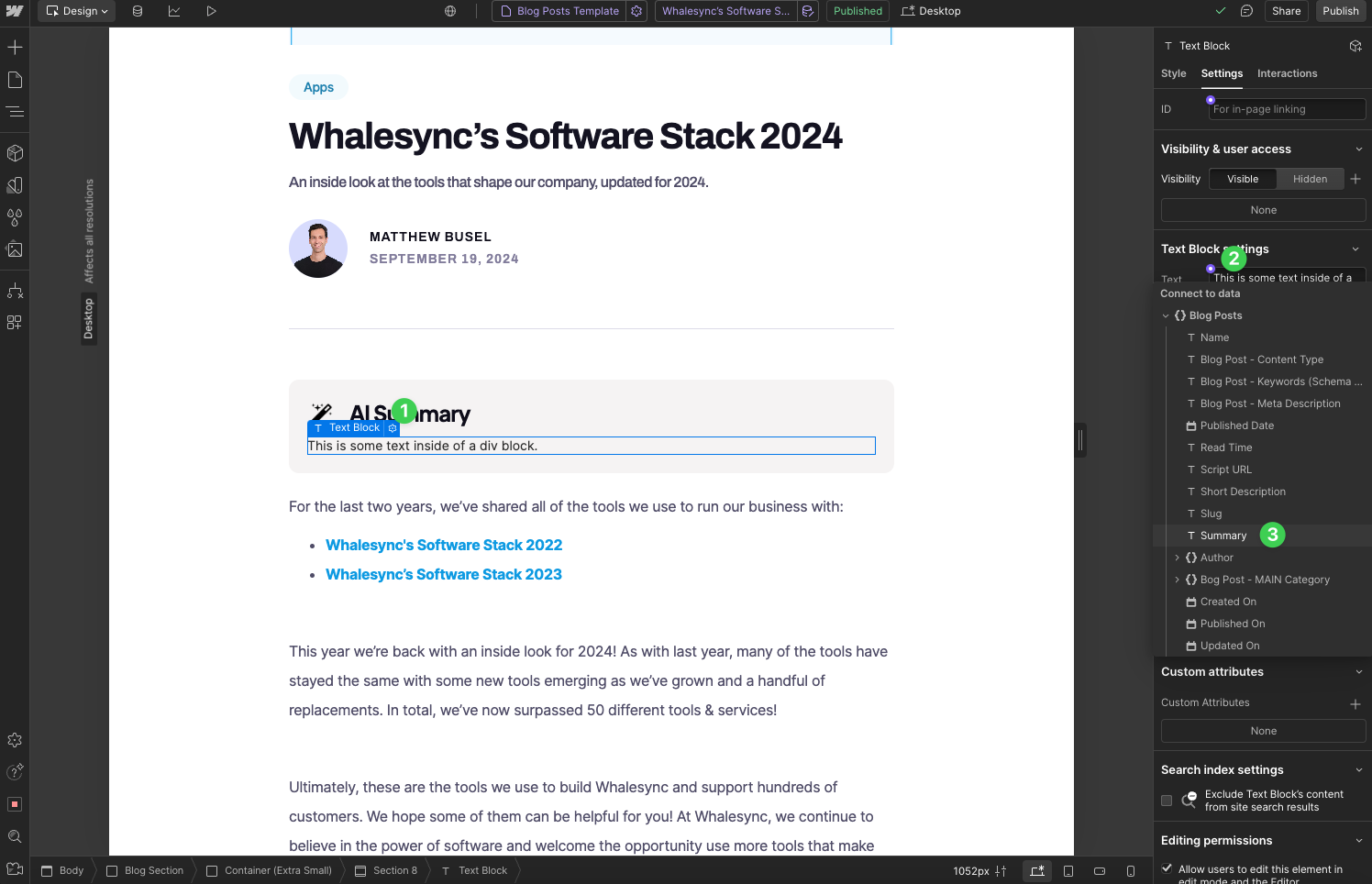 - Create a CMS-powered text block in your Blog Posts template in Webflow