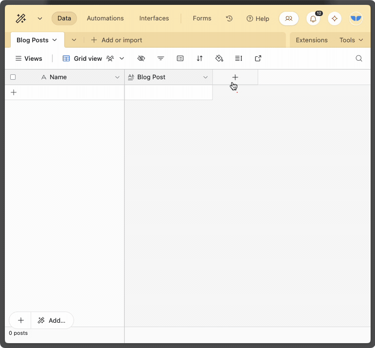 - Go to Airtable and create an Airtable base with a text field called “Name” and rich text field called “Blog Post”.