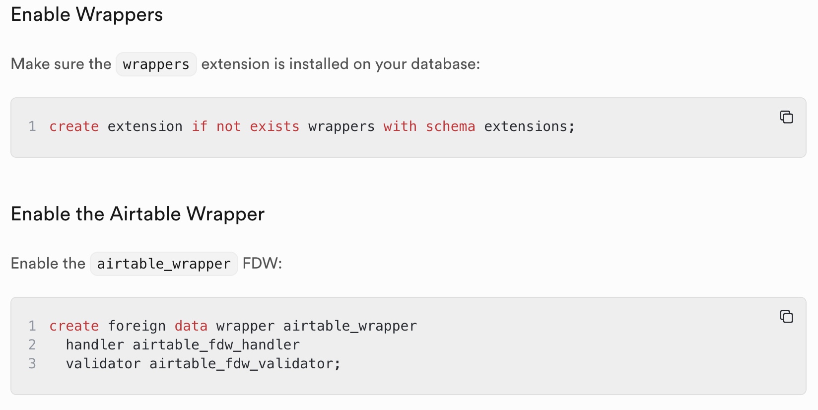 The Supabase Airtable Wrapper provides an easy way to query Airtable data directly from Supabase using Foreign Data Wrappers (FDWs). This method essentially enables you to treat Airtable as an external table in Supabase, enabling SQL queries on your Airtable data without needing to build a separate syncing solution. It’s a good option if you’re looking for an integration between Airtable and Supabase while maintaining the flexibility of SQL queries for analysis and reporting.