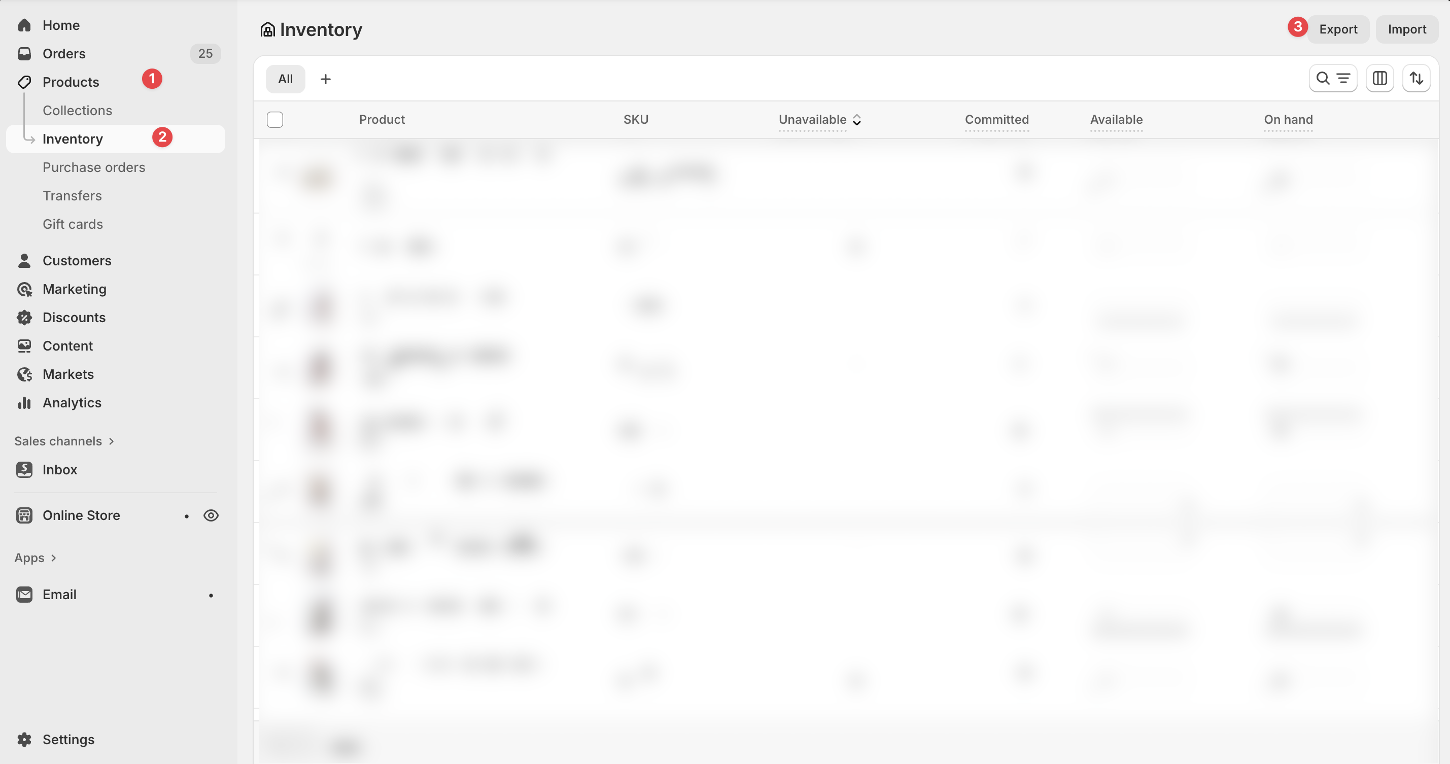 - From your Shopify Admin, go to Products → Inventory.