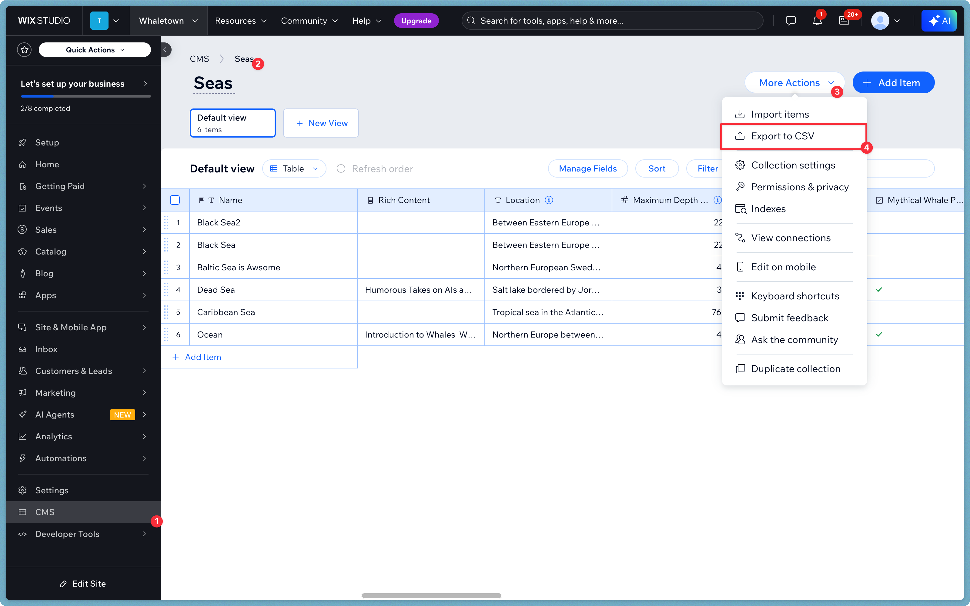 From the left-hand menu, go to CMS → Collections and select the collection you’d like to export (for example, “Blog Posts,” “Products,” or any custom dataset).At the top right of the collection, click the ⋯ (More Actions) menu.