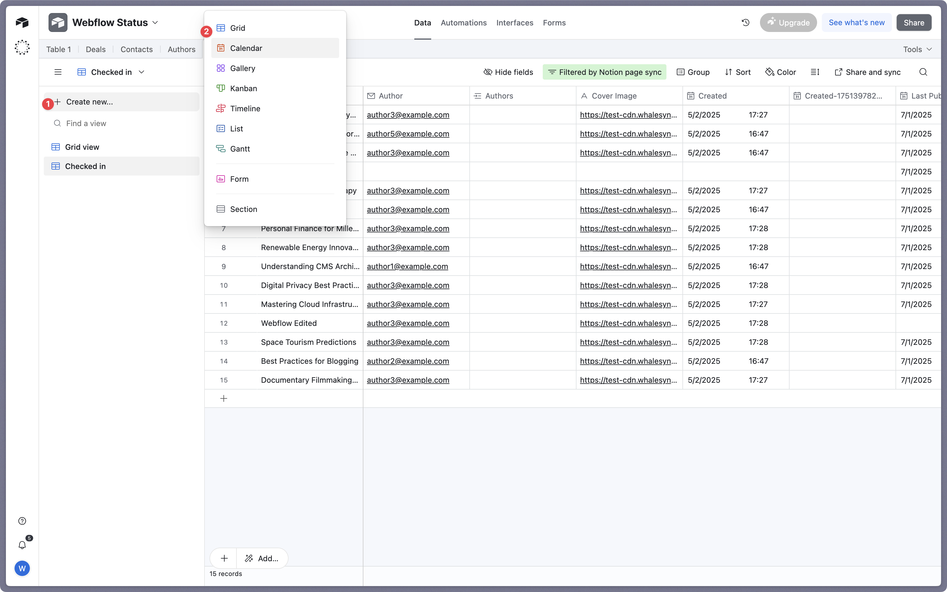 Only the records you want (like “Checked in” blog posts) will flow through, and any updates made in either Airtable or Webflow will reflect in real-time.