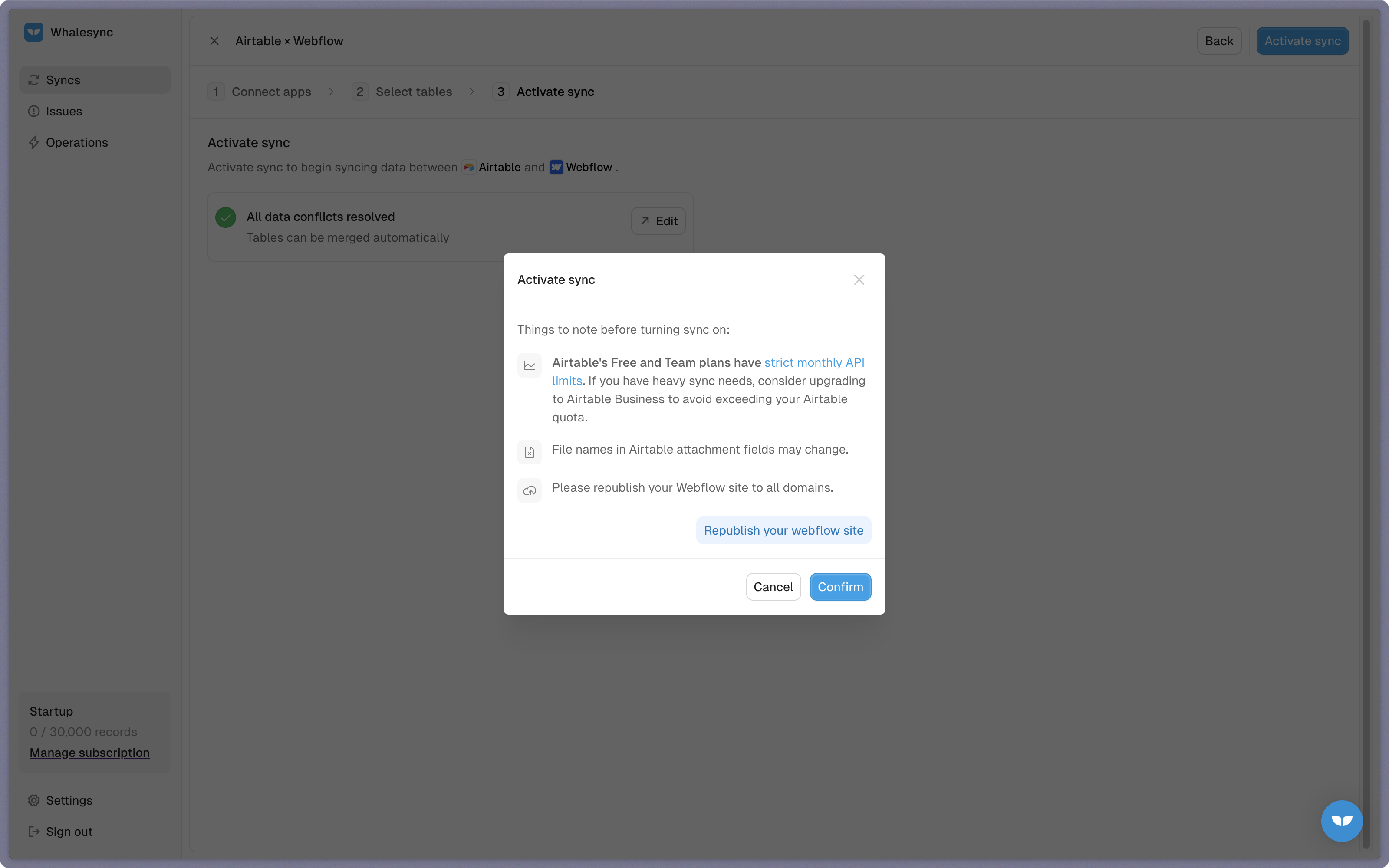 Start by connecting Airtable to Webflow with Whalesync. Once both are authorized, you’ll see the connection status for each app. Click continue.